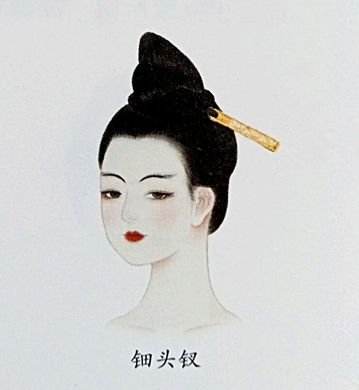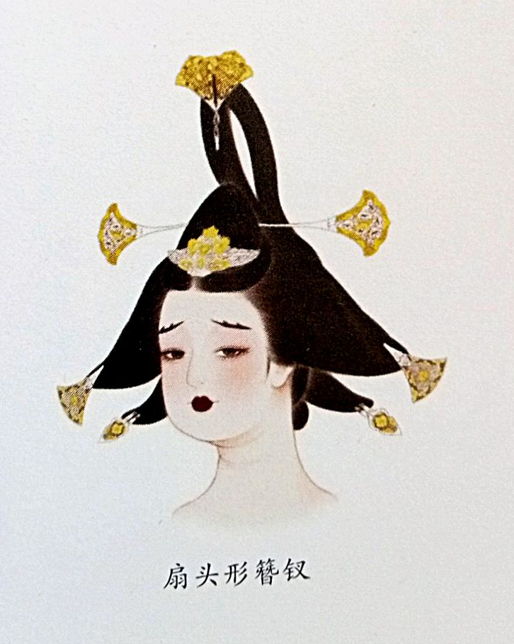 Afterward, fan-shaped hairpin (扇头形簪钗 ; shàn tóu xíng zān chāi) became popular (inferred from original jewelry found in a Tang dynasty tomb on the outskirts of Xi’an).