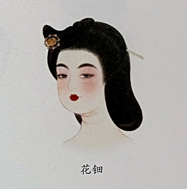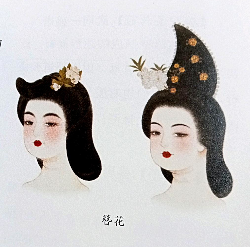 A popular style during the Tang dynasty. Flower ornaments were usually hung on golden hairpins, then secured with gold coins on the hair bun (inferred from silk paintings found in Tang dynasty tombs in Astana, Turpan, Xinjiang, and line engravings on the stone coffin of Concubine Wu Hui 武惠妃).