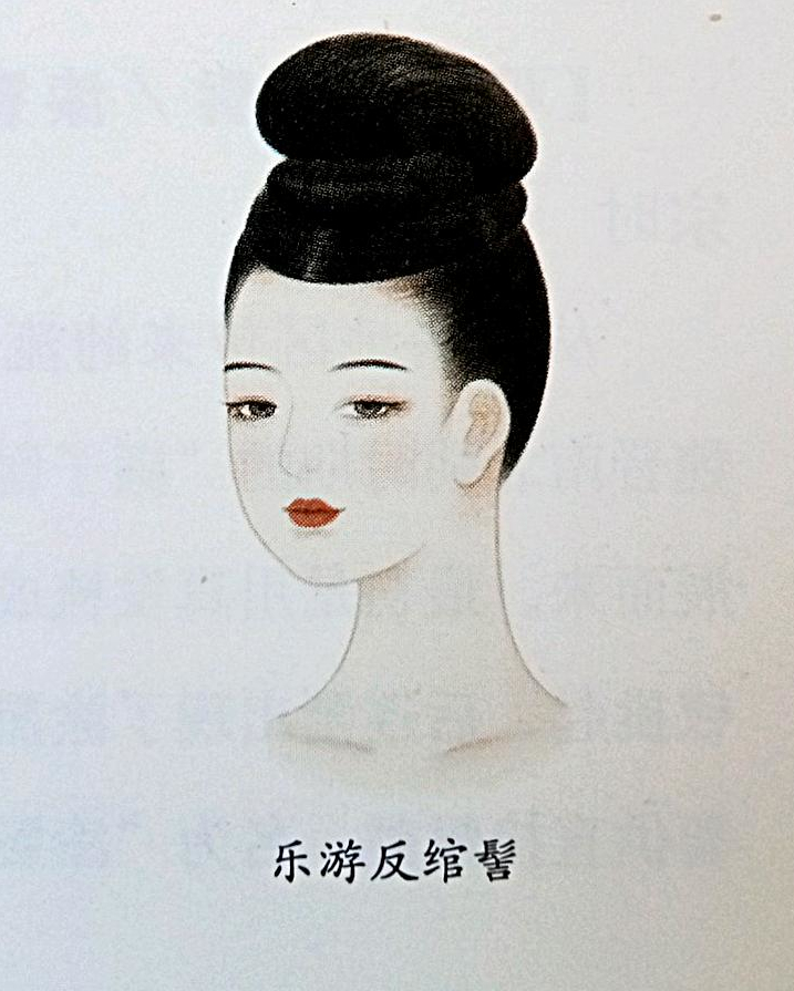 This is a high bun style that gradually spread from the imperial palace. “Le You 乐游 (lè yóu)” was the name of a highland area in the city of Chang’an at the time, indicating that this hairstyle was significantly higher than earlier styles, consistent with the meaning of “Le You 乐游.” The hair strand is coiled multiple times on top of the head, and when gathered into the main bun, it is positioned at the upper back of the head—opposite the placement of the “Fan He Ji 翻荷髻.”
