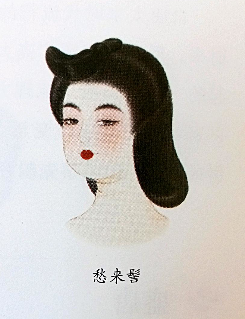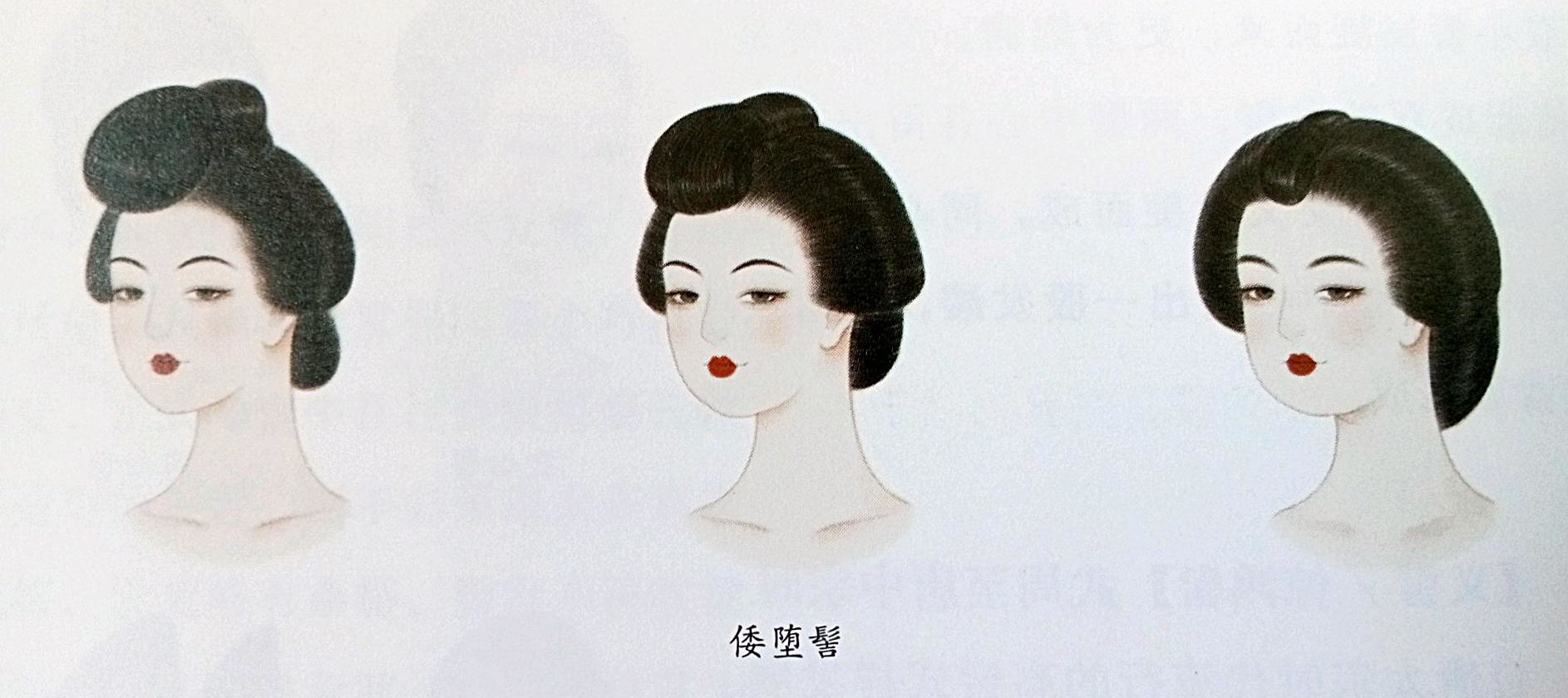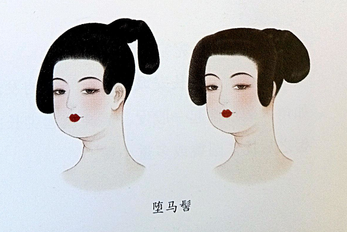 In Bai Juyi’s poem, it is mentioned as “风流夸堕髻 Charming in her proud display of a fallen coiffure.” Poetry note: “At the end of Zhenyuan, in the city, Duo Ma Ji and Ti Mei Zhuang makeup became popular again.” This hairstyle originally was a small bun with natural hair combed sideways to one side. Later, the back bun grew bigger.