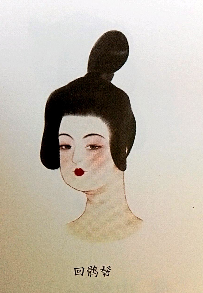 Said to have been styled by Yang Guifei, though it was a popular style among women from late Kaiyuan to early Tianbao. Hair at the temples was brushed outward in a puffed style, the back hair was left hanging loosely to the shoulders and then folded back up. A small pointed bun was styled to jut forward. The whole look appeared hastily done, as if in sorrow, with few adornments.