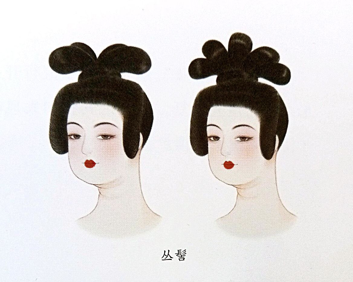 The top of the head was combed to form many small clustered buns, called “娥丛小鬟 é cóng xiǎo huán” and “翠髻高丛绿鬓虚 cuì jì gāo cóng lǜ bìn xū”. Although there were variations in the number, the most well-known were “Bai Ye Ji (百叶髻 ; bǎi yè jì)” and “Bai He Ji (百合髻 ; bǎi hé jì)”.