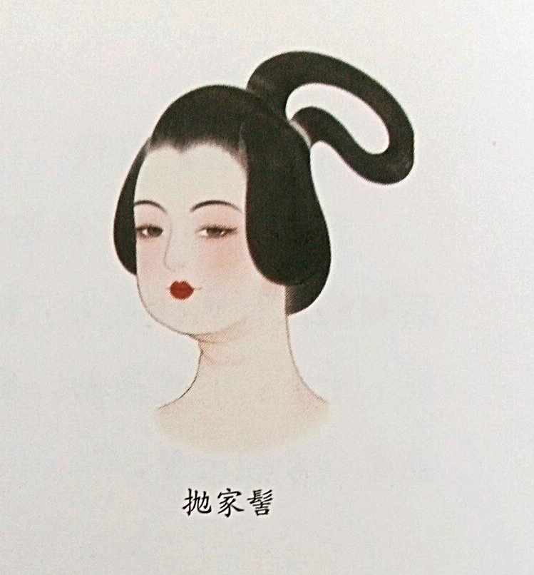 In《新唐书·五行志》it is mentioned: “At the end of the Tang dynasty, women in the capital combed their hair with both temples circling the face, shaped like a pointed bun, then called Pao Jia Ji (唐末京都妇人梳发,以两鬓抱面,状如椎髻,时谓之抛家髻).”