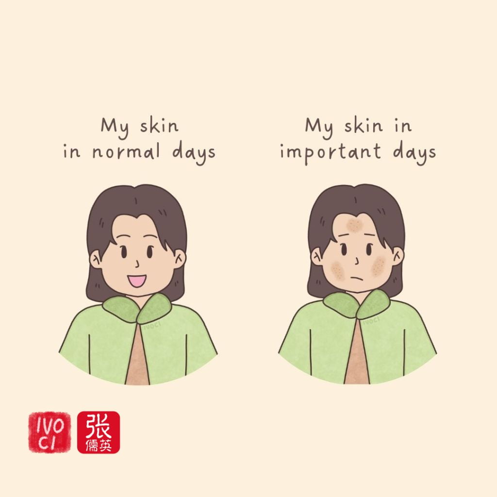 My Skin In Normal Days Vs In Important Days Illustrationby Zhang Ruying31 May 2022Animation & IllustrationSpread the love | 分享Do you relate? 😂😭 Spread the love | 分享